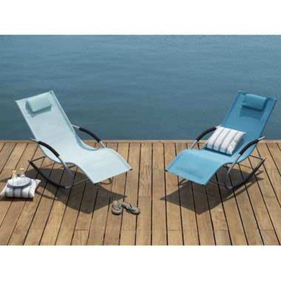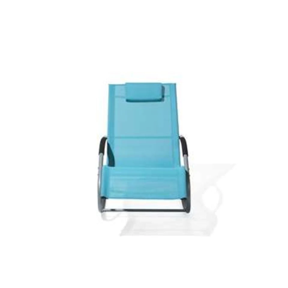 Exclusieve, blauwe tuinligstoel om in te schommelen. Dit ligbed onderscheidt zich door zijn eigentijdse, dynamische ontwerp en zal een blikvanger zijn in elke tuin, balkon of terras. Het is gebouwd met stalen geleiders en uitgerust met antisliphoezen voor een soepele en ontspannende schommelbeweging. De ergonomisch gevormde zitting is gemaakt van stof en heeft een gecapitonneerde hoofdsteun voor extra comfort.