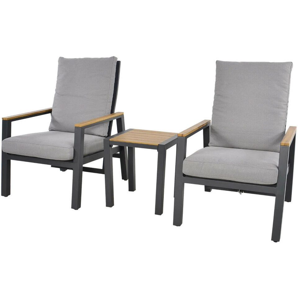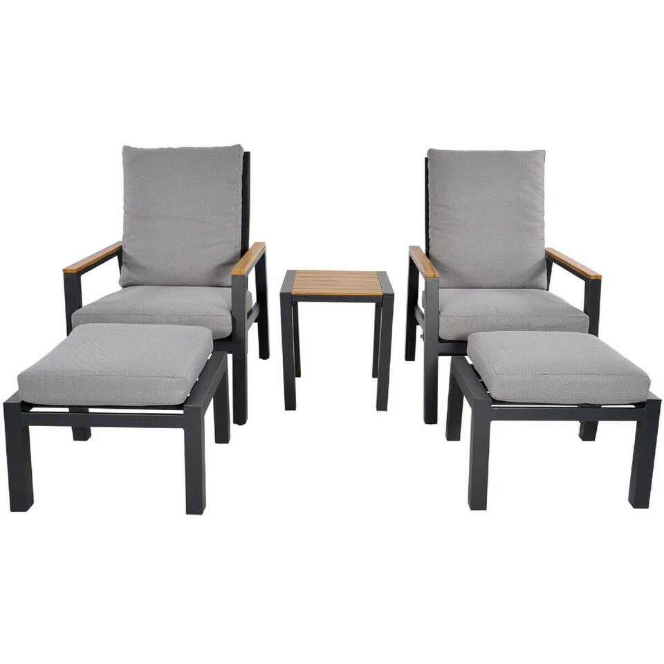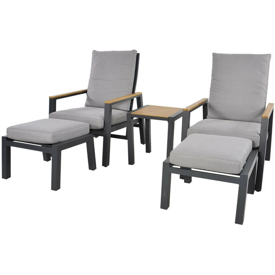 Geef uw favoriete buitenruimte een echte make-over met duoset Coda! Deze luxueuze set komt uit de collectie van het merk Les en bestaat uit twee loungestoelen, twee hockers en een loungebijzettafel. Het frame van zowel de stoelen, de hockers als de bijzettafel is uitgevoerd in stevig en onderhoudsvriendelijk aluminium met een matte donkergrijze kleur als afwerking. Opvallend aan het ontwerp van deze set zijn de aluminium details met een teaklook voor een natuurlijke touch. Verder zijn beide stoelen en de hockers voorzien van grijze kussens (270gr/m² olefin) en is de rugleuning van elke stoel kantelbaar. Plaats duoset Coda in de tuinkamer of op het terras en geniet van zijn design en comfort. Ook verkrijgbaar in het wit. Afmetingen Loungestoelen: B68xD85xH102 cm Hockers: B57xD55xH36 cm Loungebijzettafel: B45xD45xH50 cm