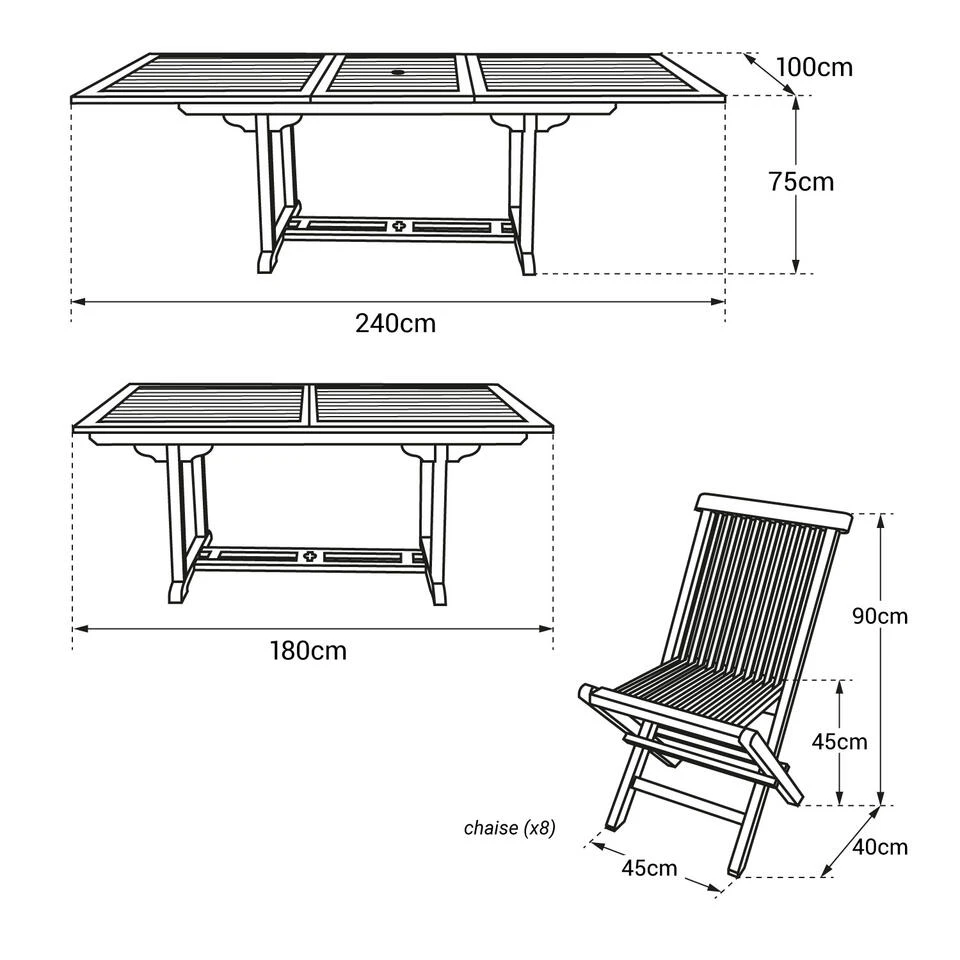 De LOMBOK tuinmeubelen bestaan uit een uitschuifbare tafel en 8 klapstoelen. Met het vlinder-verlengstuk dat gemakkelijk onder het tafelblad kan worden opgeborgen, kunt u kiezen tussen een tafel voor 6 of 8 personen. De tafel heeft een centraal gat voor een rechte parasol bij mooi weer. Het teakhout waaruit de elementen van deze tuinset zijn samengesteld, garandeert een lange levensduur en weerstand tegen de omstandigheden buitenshuis.