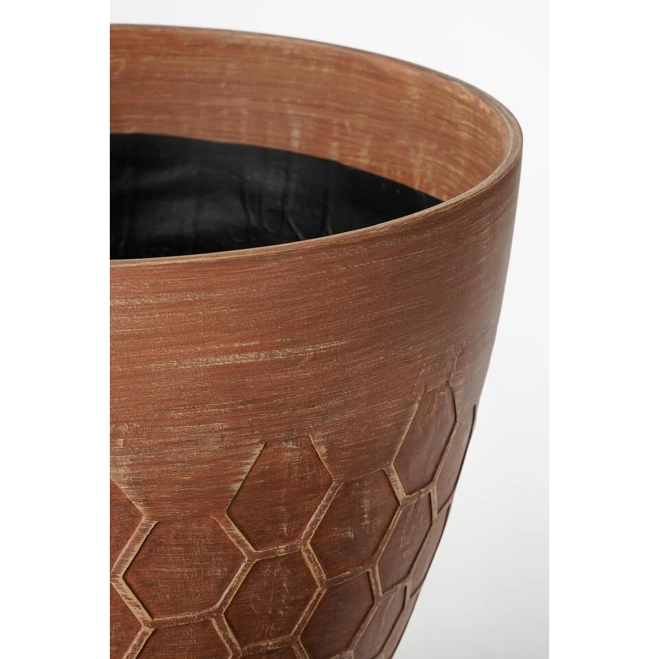 Deze Bravo bloempot van Mica Decorations heeft alle kenmerken van een stenen bloempot, op één ding na: het gewicht. De pot is namelijk gemaakt van lichtgewicht kunststof. De koperkleurige pot voor buiten valt op door de stijlvolle, honingraat structuur. Het voordeel is dat hij zowel binnen als buiten te gebruiken is. De pot is namelijk UV- en vorstbestendig. Leuk als stoere toevoeging voor in de woonkamer of voor buiten op het terras! Voor buitengebruik is het wel verstandig om het aangegeven drainage gat in de bodem te doorboren. Dit zorgt voor een goede afwatering. De Bravo bloempotten zijn verkrijgbaar in verschillende kleuren en maten. Deze koperkleurige bloempot is 32,5 cm hoog en heeft een diameter van 38 cm.