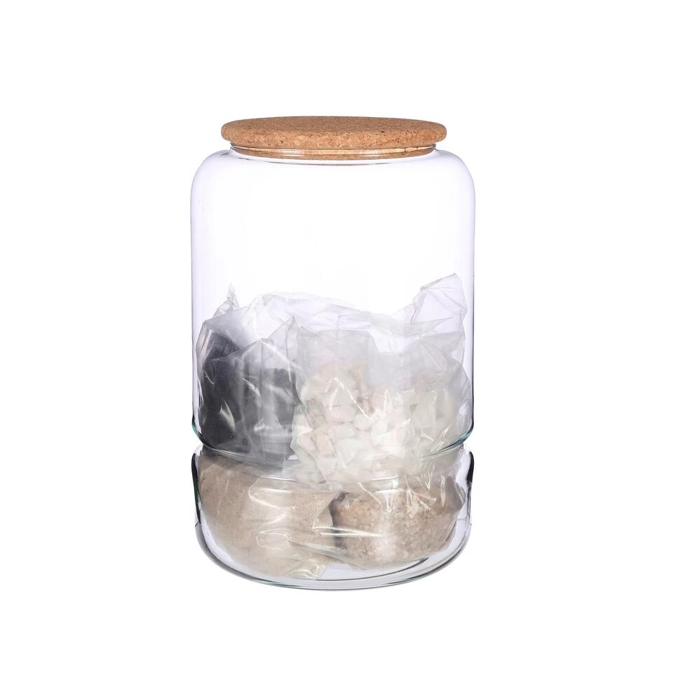 Helemaal fan van de groen-in-glas trend? Met dit item uit de collectie van Mica Decorations kun je jouw eigen terrarium creëren. De set bestaat uit een transparante vaas van gerecycled glas, een kurken deksel, mos, steentjes en aarde. Nu hoef je alleen nog maar wat plantjes uit te zoeken! De afmetingen van de glazen pot zijn H28 x Ø19 cm.