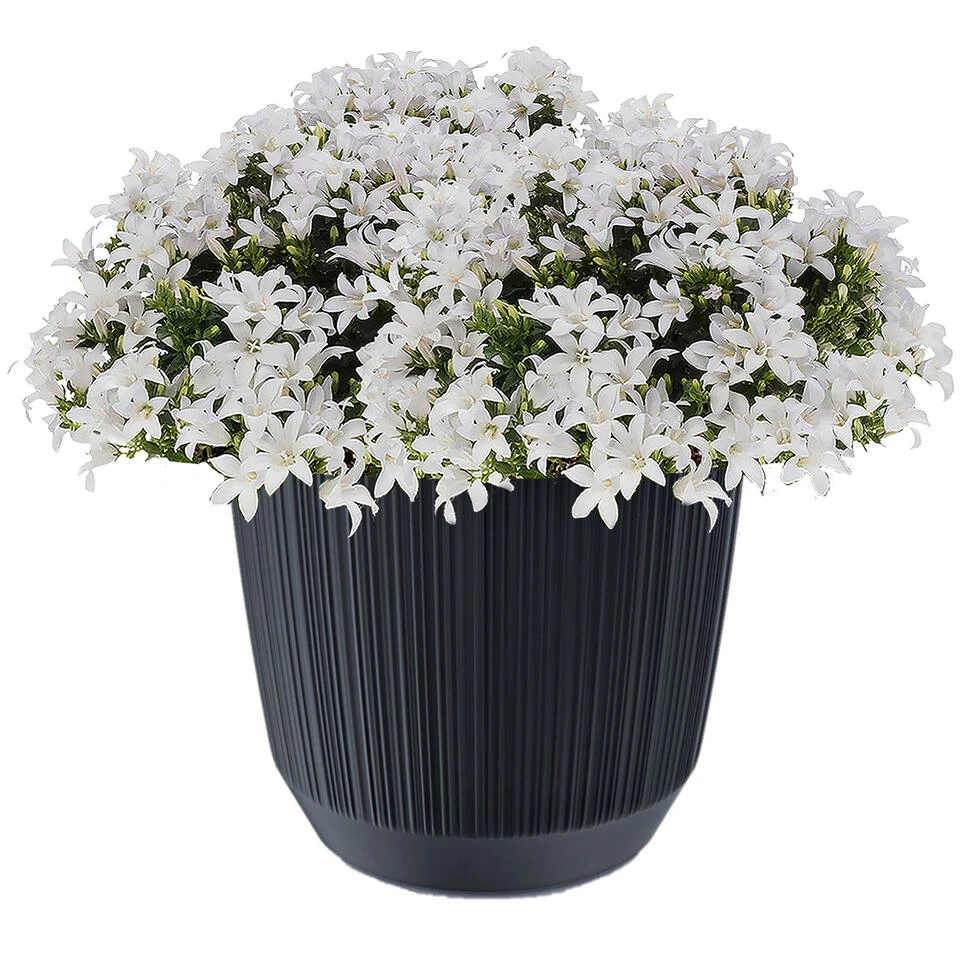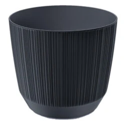 Moderne carf-stripe plantenpot/bloempot van kunststof met diameter 19.5 cm en hoogte 17 cm in het antraciet grijs. Geschikt voor buiten en binnen. Vorstbestendig ja. Basic plantenpotten voor in de tuin, balkon of binnen.