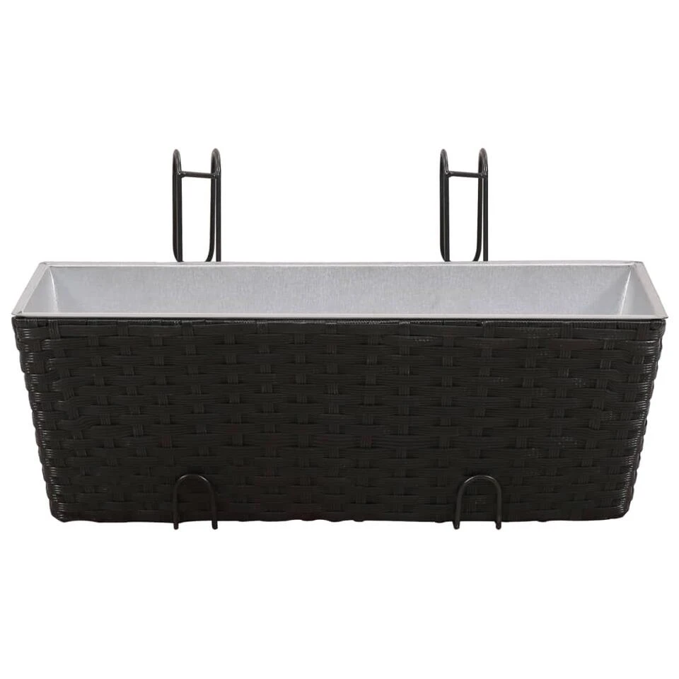 Deze prachtige hangplantenbakkenset bestaat uit 2 rattan potten en 2 uitneembare zinken potten. De rattan is gemaakt van duurzaam waterbestendig wicker waardoor deze plantenbakken een perfecte aanvulling op je buitenruimte zijn. Ze passen op bijna alle balkonrailings.